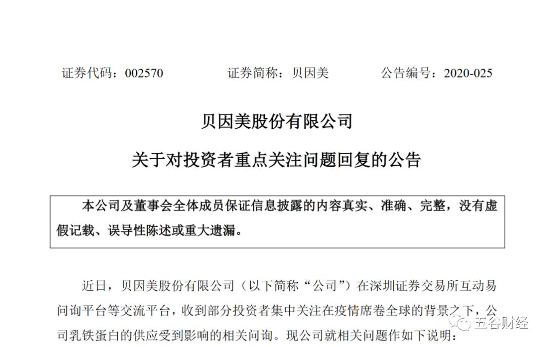 日前,貝因美在深交所互動易問詢平臺等交流平臺上,收到部分投資者集中關注在疫情席卷全球的背景之下,公司乳鐵蛋白的供應受到影響的相關問詢。 據悉,乳鐵蛋白是生產嬰幼兒配方奶粉的主...