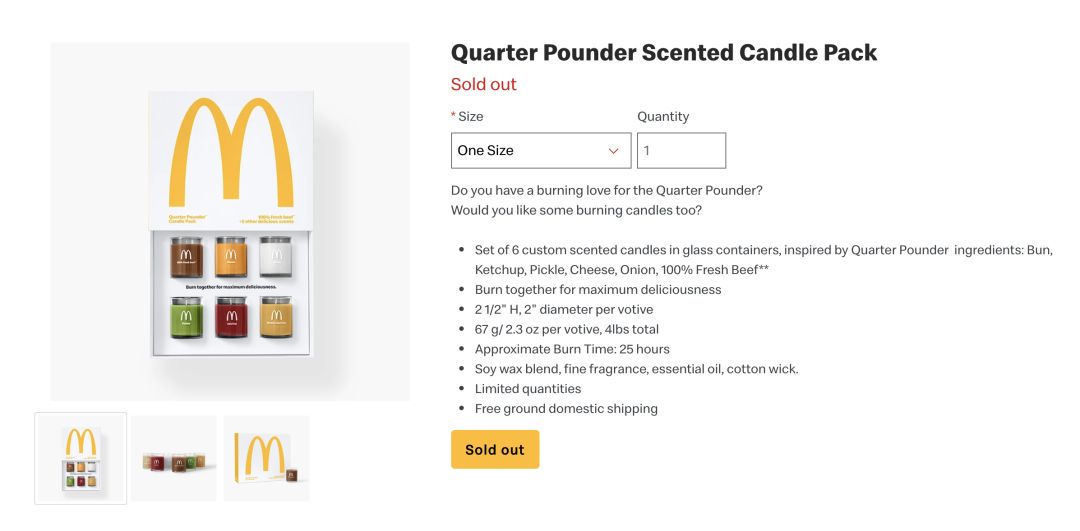 為了慶祝足三兩漢堡(QuarterPounderwithCheese)推出50周年,近期麥當(dāng)勞在官方周邊GoldenArchesUnlimited網(wǎng)站,推出了漢堡味的香薰蠟燭。...