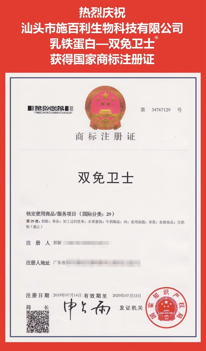 熱烈祝賀施百利(汕頭)生物科技有限公司嬰幼兒食品營養品——雙免衛士,獲得國家5類商標注冊證;乳鐵蛋白——雙免衛士獲得國家29類商...