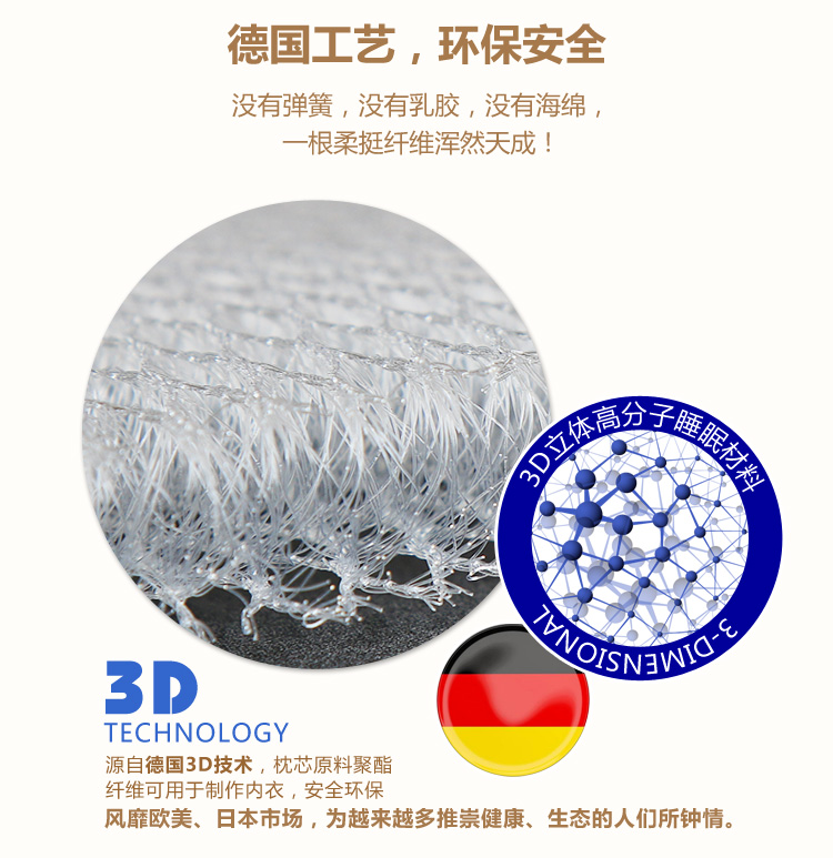澳貝兒品牌系列產品選用來自德國工藝的3D立體高分子睡眠材料,開啟枕頭水洗新時代,3D立體高分子睡眠材料,可水洗,枕頭好洗快干,抗菌防螨,360度零死角,透氣性好,也稱為全水洗,會呼吸的枕頭。澳貝兒關注寶寶成長睡眠,伴隨千萬中國寶寶一起成長。