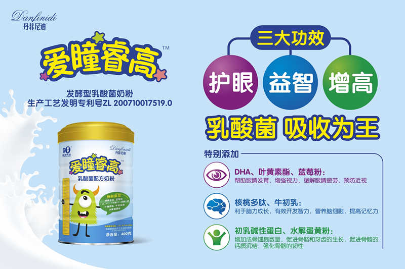 隨著時代的發(fā)展,目前越來越多電子產(chǎn)品的普及,而現(xiàn)代孩子的學習量的逐漸增加,所帶來的眼睛損傷和大腦壓力越來越來大,必須攝取更多的營養(yǎng)來保證孩子的營養(yǎng)供給,營養(yǎng)是孩子生長發(fā)育的基礎,也是人類賴以生存的重要條件。蛋白質(zhì)、脂肪、碳水化合物、膳食纖維、維生素及各種微量元素等,都是保障孩子健康成長必不可少的基礎營養(yǎng),又是影響孩子身高增長、腦部發(fā)育的關鍵營養(yǎng)。保持營養(yǎng)的全面均衡和足量,吸收是關鍵,而作為超級益生菌的乳酸菌,是人體必不可少且具有重要功能性有益菌,它的數(shù)量多少直接影響到了人的健康和壽命長短。它有利于正常腸道菌群的生長和繁殖,在改善腸內(nèi)代謝、消化和吸收功能,增加免疫力有獨特的功效。 丹菲尼迪乳酸菌系列奶粉菌種屬于進口丹尼斯克乳酸菌菌種,是將高活性的乳酸菌經(jīng)過本司獨家專利發(fā)酵工藝添加到無抗奶中制作而成,屬于調(diào)理并改善腸胃、補充身體有益菌的功能性(發(fā)酵型)產(chǎn)品。通過不斷的升級創(chuàng)新,研發(fā)出一系列的丹菲尼迪乳酸菌奶粉,其中丹菲尼迪愛瞳睿高乳酸菌配方奶粉在調(diào)理腸胃的基礎上針對性的添加了有助于骨骼生長、保護視力、益智護腦的成分,如水解蛋黃粉、初乳堿性蛋白、DHA、藍莓粉、葉黃素酯、核桃多肽、牛初乳粉等。水解蛋黃粉和初乳堿性蛋白可以增加成骨細胞數(shù)量并促進骨骼和牙齒的生成,激活骨骼自身的原動力、促進骨骼的伸長;促進骨骼的鈣質(zhì)沉結(jié),強化骨骼的韌性,抑制破骨細胞的生長,維持骨骼成分的平衡; DHA是神經(jīng)系統(tǒng)細胞生長及維持的一種主要營養(yǎng)物質(zhì),是大腦和視網(wǎng)膜的重要構(gòu)成成分,對智力和視力發(fā)育至關重要;而藍莓粉和葉黃素酯的添加可以增強視力,緩解眼睛疲勞、預防近視。