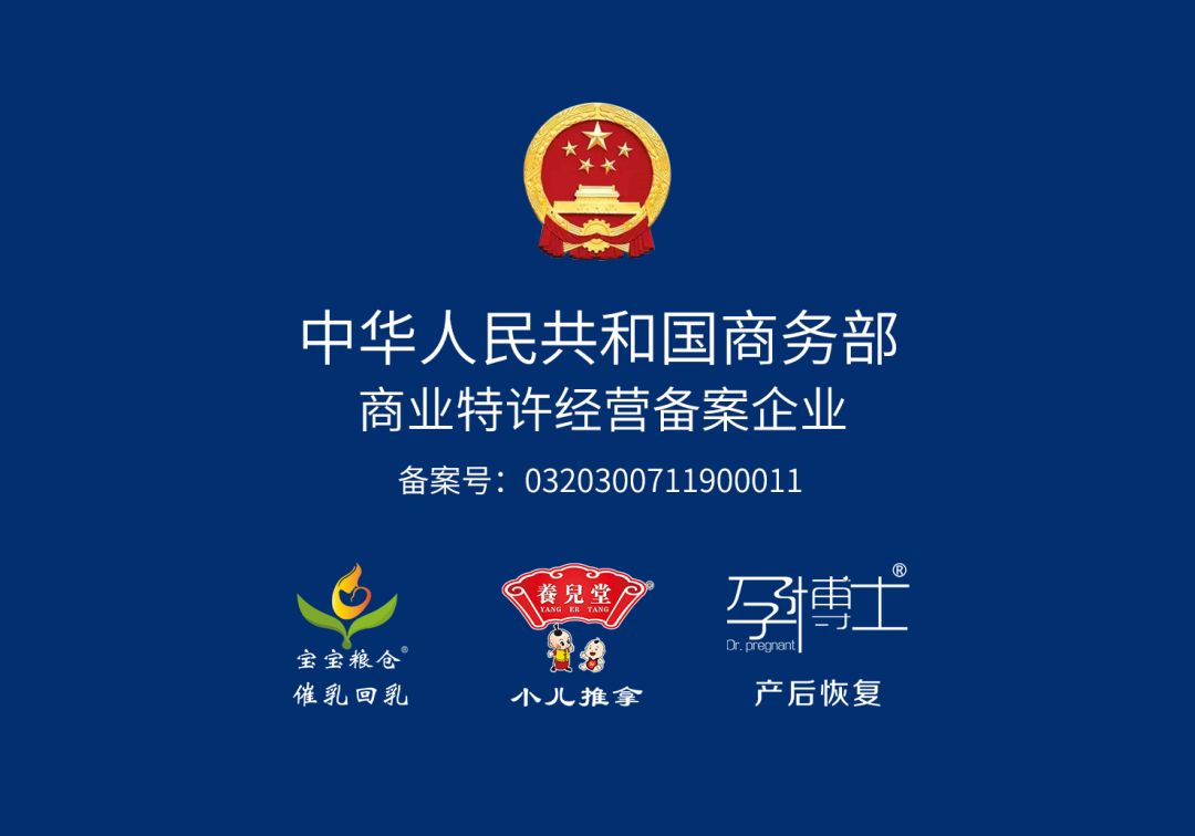 接國家商務部文件通知,根據國家《商業特許經營管理條例》、《商業特許經營備案管理辦法》,經嚴格審核,認定“寶寶糧倉”及旗下“孕博士”、“養兒堂”品牌符合國家商務部各項規定,特批通過商務部商業特許經營備案,備案號:0320300711900011。此次特許,寶寶糧倉集團將成為我國孕產調養行業唯一一家獲得商務部特許經營備案的企業!
