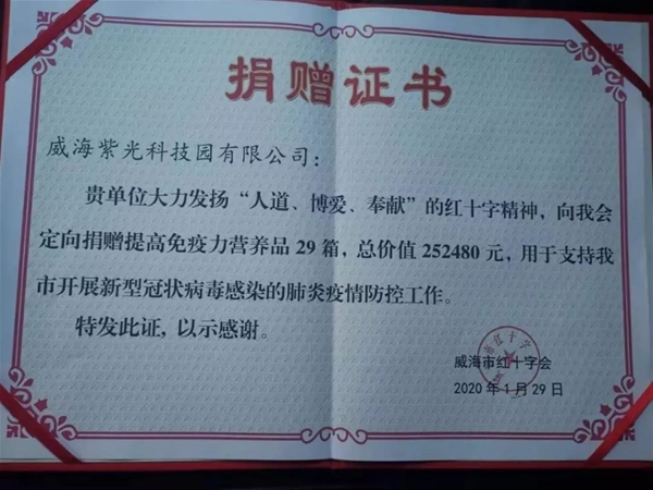 面對疫情蔓延全國的嚴峻形勢,威海紫光立即行動,1月29日,向威海紅十字會捐贈價值25萬多元用于提高免疫力的營養保健品。