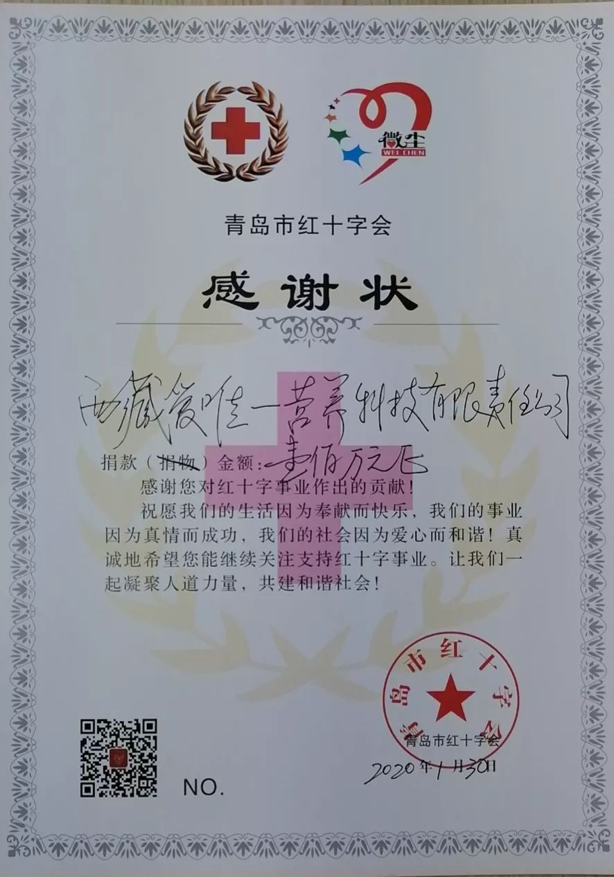 為支持抗擊疫情,2020年1月30日,索康愛可丁奶粉攜手愛唯一啟動捐贈計劃,向青島紅十字會捐贈現金及營養補充劑共300萬。 其中,100萬元人民幣已于1月30日匯款至青島紅十字會,用于購買防護服、口罩、消毒液等醫療防護用品等。 價值200余萬元的營養補充劑將根據需要用于白衣天使等辛苦工作在戰役一線人員及家屬使用。