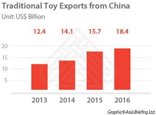 2016年,中國玩具業增長強勁,與中國近期輕工業的發展趨勢相反。2016年中國出口總額下降了7.7%,進口總額下降了5.5%。而玩具出口增長了9.5%,進口增長了23%。 雖然印度和越南較低的生產成本吸引了很多投資者,但由于中國的玩具制造工藝良好,且玩具消費市場的蓬勃發展,中國的玩具市場前景大好。鑒于中國玩具行業的成熟度,外國投資者要進入中國市場,與成熟的企業進行競爭,必須制定一定的戰略計劃。 中國玩具市場概述 中國是世界上最大的玩具制造商,全球70%的玩具供應都來自中國。2016年中國玩具出口總額達337億美元,其中玩具娃娃、拼圖玩具、教育玩具等傳統玩具的總價值達184億美元。中國大部分的玩具出口是來自國外品牌的OEM(代加工)訂單。