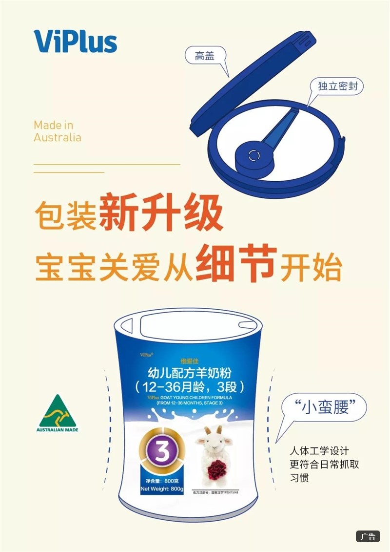 從細(xì)微之處關(guān)愛你 低蓋到高蓋,增強(qiáng)密封性 維愛佳嬰幼兒配方羊奶粉新包裝將平蓋升級為藍(lán)色高蓋,很大程度上增強(qiáng)了產(chǎn)品的整體密封性,并將奶粉勺置于密閉空間,隔離污染。 細(xì)腰不止是好看 從傳統(tǒng)的直罐升級為“小蠻腰”,利用了人體工學(xué)設(shè)計(jì),更加符合手掌拿放行為,便于抓取,以小見大,為寶媽帶去更多便捷,美感與實(shí)用完美結(jié)合。 官方藍(lán) 盡顯純凈 藍(lán)白撞色的罐體圖設(shè)計(jì)理念更符合澳洲天藍(lán)水凈的自然環(huán)境,讓消費(fèi)者能夠感受到維愛佳吉普斯蘭天然牧場的純凈。 全羊配方 由內(nèi)而外的呵護(hù) ViPlus維愛佳嬰幼兒配方羊奶粉是維愛佳針對中國寶寶的體質(zhì)重磅推出的匠心之作,配方溫和,富含天然營養(yǎng)物質(zhì)。 并采用全羊乳清配方,添加了足量優(yōu)質(zhì)乳鐵蛋白,含量達(dá)到30mg/100g,滿足寶寶成長需要。 堅(jiān)持純羊乳清配方,羊乳清蛋白在胃中形成的凝塊細(xì)而軟,讓寶寶更易吸收,不易便秘、不易上火、不易過敏;無蔗糖、麥芽糊精、香精/香料,以減輕嬰幼兒腎臟負(fù)擔(dān);