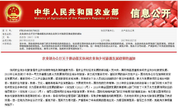 | 農業部辦公廳關于推動落實休閑農業和鄉村旅游發展政策的通知 |