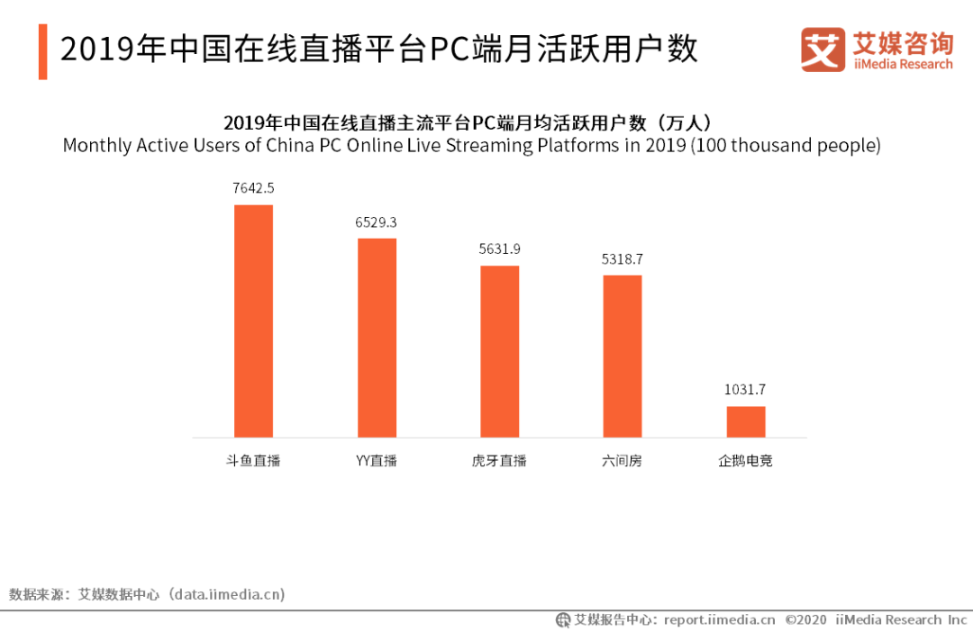2019年中國在線直播平臺PC端月活躍用戶數 iiMedia Research(艾媒咨詢)數據顯示,2019年中國在線直播平臺PC端月均活躍用戶數方面,斗魚直播處于領先地位。娛樂類直播平臺中,YY直播居于首位,六間房增長態勢最為明顯。