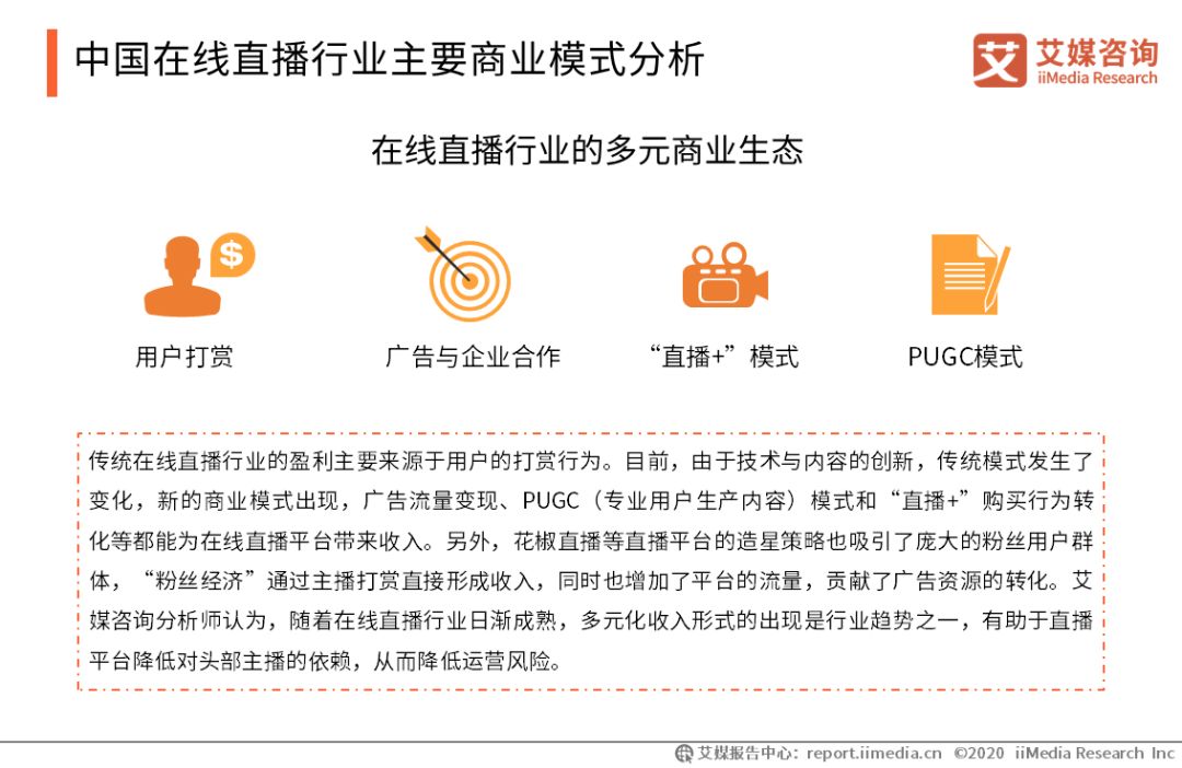 中國在線直播行業發展趨勢預測 “直播+”商業模式創新,探索商業價值 未來“直播+”趨勢將進一步發展,在線直播向細分領域拓展,例如垂直市場中的電商、教育等,內容垂直化更加明顯。在線直播內容與形式多樣化發展,滿足用戶的多元化需求,商業模式繼續創新,在線直播的商業價值將進一步開發。 直播“出圈”,在線直播關注度提升 直播更加“出圈”,在線直播更加日常化、生活化。由于技術的成熟,媒體信息將更加強調動態、實時,在線直播在媒體上的滲透率將增加,互聯網用戶的參與度以及直播的關注度將進一步提升。 在線直播專業化運營,主播生態建設更加完備 在線直播行業將更加注重精細化與專業化運營,產業鏈布局更加齊全完善。平臺通過產品與形式的創新立足自身的差異化特點,避免陷入內容同質化,并通過加強主播生態的構建等舉措,強化平臺優勢,在激烈的競爭格局中贏取用戶。 在線直播市場下沉發展 用戶下沉是近年來互聯網發展的關鍵點之一,對于三四線城市的用戶,娛樂方式較少,而空閑的娛樂時間較為豐富,加強對該部分用戶的挖掘,可以為在線直播開辟市場空間。在線直播市場下沉發展,也將推進在線直播在內容與形式上的創新。 電商直播勢頭強勁,在線直播助力賣貨 傳統電商流量紅利風口已過,而在線直播的實時性、互動性極大地增強了用戶體驗,降低了用戶在電商購物中的不確定性,增強了用戶消費沖動,提升了轉化率。未來電商直播將繼續發展,主播應注意利用自身的口碑及社交關系,形成用戶沉淀,從而在電商直播中脫穎而出。 技術賦能,實時交互等性能加速發展 在線直播平臺將繼續借助技術為其賦能,通過布局5G、VR、AI等技術獲取差異化優勢并尋求平臺留存用戶、提高收益的突破點。多元化實時交互功能加速發展,在線直播平臺通過技術實現布局更多業務的可能。 以上內容節選自艾媒研究院發布的《2019-2020年中國在線直播行業研究報告》
