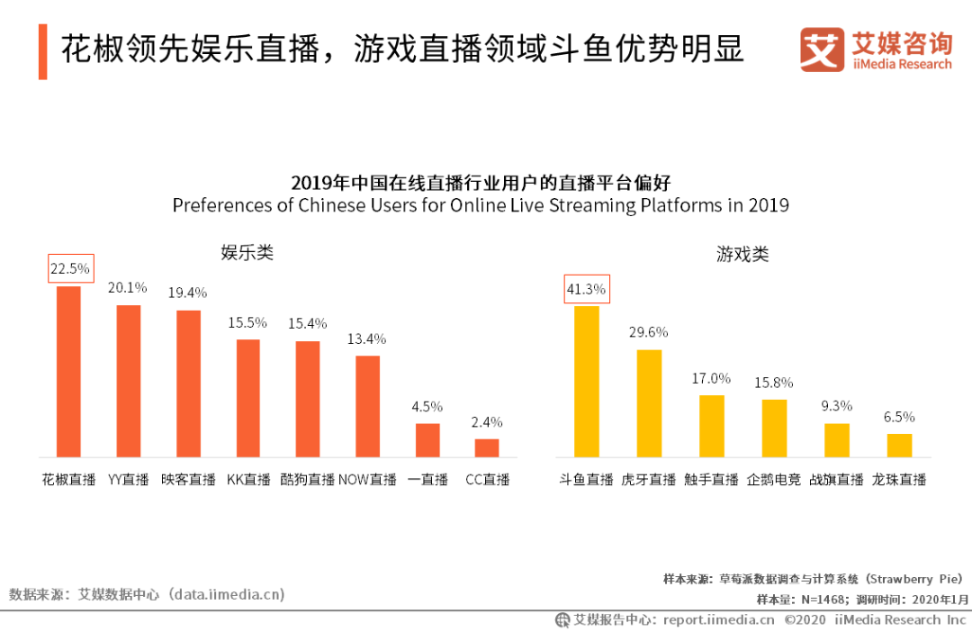 花椒領先娛樂直播,游戲直播領域斗魚優勢明顯 iiMedia Research(艾媒咨詢)數據顯示, 2019年中國娛樂類在線直播平臺中,花椒直播與YY直播在用戶偏好方面處于領先地位,其中22.5%的用戶表示經常使用花椒直播平臺。在游戲直播平臺中,斗魚直播受歡迎程度最高,超過四成的用戶表示平時經常使用斗魚直播,與其余游戲類直播平臺拉開差距,在用戶偏好方面優勢較為明顯。