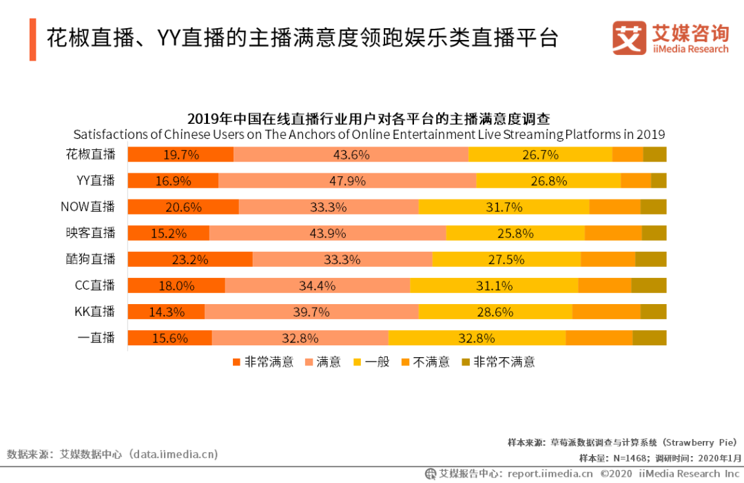 花椒直播、YY直播的主播滿意度領跑娛樂類直播平臺 iiMedia Research(艾媒咨詢)數據顯示, 2019年中國在線直播行業用戶對各娛樂類直播平臺的主播的總體滿意度較高,其中頭部直播平臺,如花椒直播、YY直播的主播有較多正面評價。結合前面數據可見,直播平臺的主播質量對吸引、留存用戶有較大的影響。因此,艾媒咨詢分析師認為,各在線直播平臺應注重主播的培養和管理。
