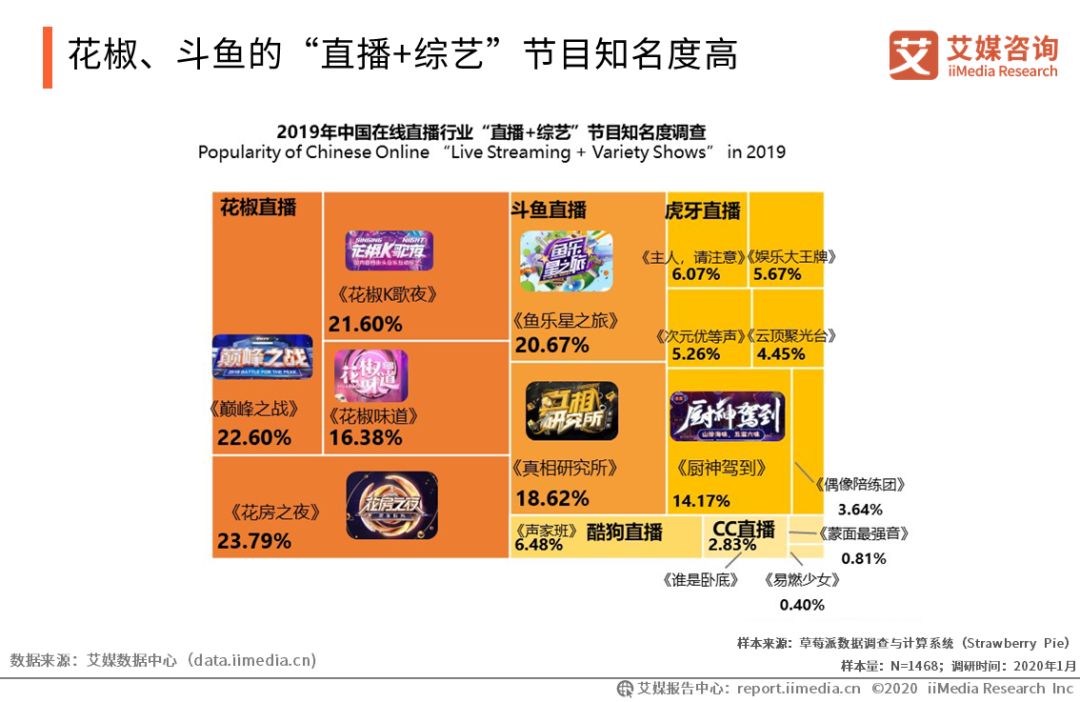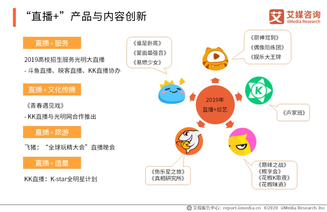 花椒、斗魚的“直播+綜藝”節目知名度高 iiMedia Research(艾媒咨詢)數據顯示, 2019年花椒直播、斗魚直播在“直播+綜藝”領域中表現亮眼,平臺的“直播+綜藝”節目知名度較高。艾媒咨詢分析師認為,大部分直播用戶出于娛樂需求觀看直播節目, 而“直播+綜藝”節目娛樂性強,直播平臺可以此豐富平臺自身內容生態,持續優質內容輸出,在“直播+”模式中取得競爭優勢。