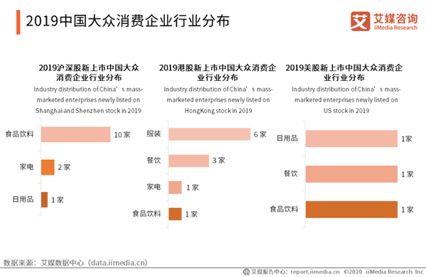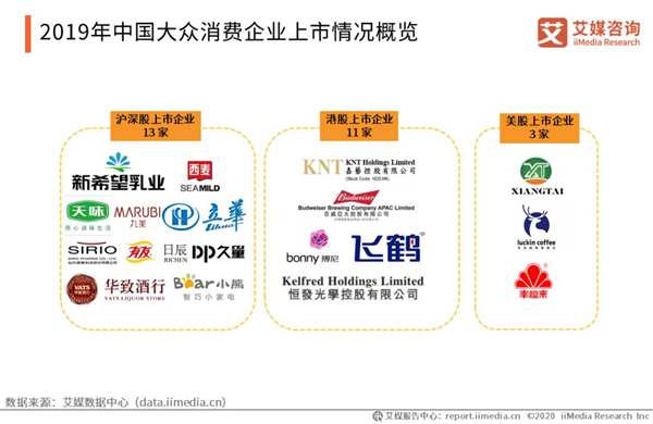 iiMedia Research(艾媒咨詢)數(shù)據(jù)顯示,2019年合計(jì)27家中國(guó)大眾消費(fèi)行業(yè)公司首次公開招募,其中14家企業(yè)在港股及美股市場(chǎng)上市,但上市首日破發(fā)的企業(yè)高達(dá)9家,且近年在境外市場(chǎng)退市的中國(guó)大眾消費(fèi)企業(yè)也較滬深股更多。境外資本市場(chǎng)較為寬松的條件吸引上市企業(yè)選擇,但對(duì)于企業(yè)自身而言,核心競(jìng)爭(zhēng)力提升才是關(guān)鍵。 (《2019中國(guó)大眾消費(fèi)企業(yè)IPO分析報(bào)告》完整高清PDF版共33頁(yè),可點(diǎn)擊文章底部“閱讀原文”進(jìn)行報(bào)告下載) 本報(bào)告研究涉及企業(yè)/品牌/案例 新乳業(yè),西麥?zhǔn)称罚煳妒称罚杳拦煞荩⑷A股份,有友,日晨股份,華致酒行,小熊家電,中國(guó)飛鶴,瑞幸咖啡,新諾威,久量股份,仙樂健康,三只松鼠,嘉藝控股,植華集團(tuán),百威亞太,博尼控股,幸福來,優(yōu)品360,太興集團(tuán),利華控股集團(tuán),香態(tài)食品,登輝控股,賞之味 2019年共27家大眾消費(fèi)企業(yè)IPO,超四成為食品飲料企業(yè)。2019年滬深股、港股、美股累計(jì)有27家大眾消費(fèi)企業(yè)IPO,其中44.4%為食品飲料行業(yè)企業(yè)。互聯(lián)網(wǎng)和新零售發(fā)展趨勢(shì)下,大眾消費(fèi)企業(yè)發(fā)展受到?jīng)_擊,在產(chǎn)品和業(yè)務(wù)創(chuàng)新上表現(xiàn)較好的食品飲料企業(yè)資本市場(chǎng)更進(jìn)一步。 大眾消費(fèi)企業(yè)境外資本市場(chǎng)表現(xiàn)欠佳,2019年上市首日破發(fā)企業(yè)達(dá)9家。2019年在港股和美股上市的中國(guó)傳統(tǒng)消費(fèi)企業(yè)達(dá)14家,而上市首日破發(fā)的高達(dá)9家。境外資本市場(chǎng)上市條件相對(duì)更為寬松,也成為近年上市企業(yè)的市場(chǎng)選擇,但對(duì)于企業(yè)而言,自身競(jìng)爭(zhēng)力提升才是關(guān)鍵。 市值領(lǐng)漲港股企業(yè)居多,漲幅前十企業(yè)七成來自服裝行業(yè)。2018-2019年市值漲幅排名前十的企業(yè)中,境外上市企業(yè)高達(dá)7家,其中6家為港股企業(yè)。行業(yè)方面,市值漲幅前十企業(yè)中七成為服裝企業(yè),其余三家均為食品行業(yè)企業(yè)。 報(bào)告節(jié)選內(nèi)容 中國(guó)大眾消費(fèi)企業(yè)定義 本報(bào)告主要對(duì)食品飲料(飲料、食品)、服裝(服裝、服飾與奢侈品)、超市(多元化零售)、日用品(家庭與個(gè)人用品)、家電(家用電器)和餐飲(餐館)六大行業(yè)為主的傳統(tǒng)消費(fèi)企業(yè)在滬深股、港股、美股三大資本市場(chǎng)情況進(jìn)行研究分析。
