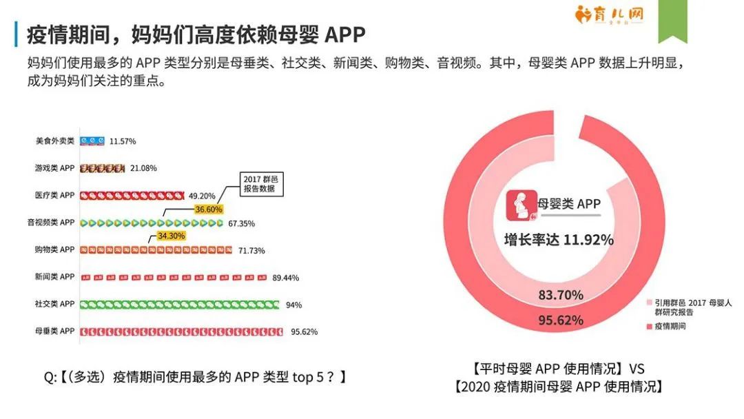 在更需要保護的弱小群體前,不論是孕媽還是寶媽,都變得更加堅強。為母則剛,不論是擔憂還是關注,焦點始終在孩子身上。 有機可尋:母垂類APP迎來上升期 疫情讓用戶足不出戶,手機APP成了了解外界,傳情達意,娛樂生活的必須,APP使用數據也成為分析母嬰人群動態最關鍵最重要的依據。 通過調查,我們發現媽媽們使用最多的五種APP類型是母嬰垂直類(簡稱母垂類)、社交類、新聞類、購物類、音視頻類。后四項APP在普通人群中的使用比例也相當高,移動社交、網絡媒體、在線娛樂大大豐富了出門受限期間人們的業余生活。不過值得注意的是,在疫情期間,母嬰類APP數據上升最為明顯,增長率從2017年的83.7%增加到95.62%,增長率達11.92%。