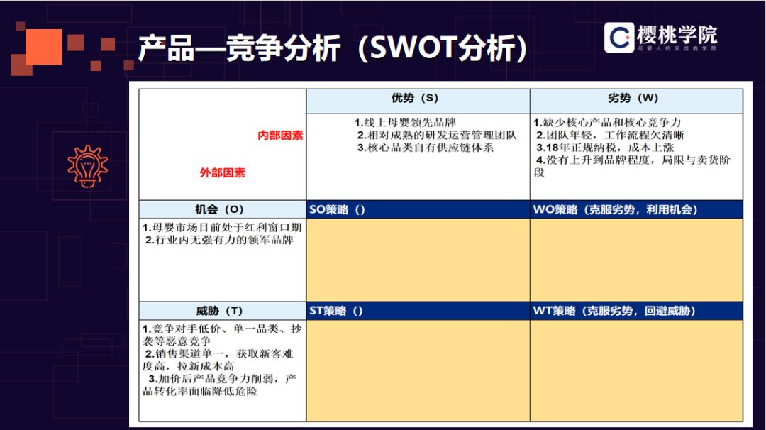 滲透力包括紙尿褲、嬰幼兒牛奶粉、睡袋、洗護用品等; 復(fù)購力包括嬰幼兒牛奶粉、嬰童褲子、套裝、運動鞋等; 價格力包括紙尿褲、濕巾、手推車等,很多品牌是依靠產(chǎn)品顏值提升價格力的。紙尿褲是一個廝殺比較厲害的品類,但是在2019年依然有品牌脫穎而出,例如babycare,它整體的顏值是比較高的,從而拉升了價格力,可以對比一下它的價格和店鋪,憑借顏值增加了產(chǎn)品的溢價能力; 延展力包括嬰童板鞋、孕婦褲中的直筒褲、孕產(chǎn)修復(fù)儀中的產(chǎn)后塑形等儀器,以及孕婦裝里的孕產(chǎn)婦鈴鐺。另外舉一下之前在可優(yōu)比做過的一個品類作為例證,就是防摔枕。防止寶寶學(xué)步時仰摔到頭部,這一產(chǎn)品解決了用戶的痛點,用戶自然會買單,這也是延展出來的一個產(chǎn)品。 1、根據(jù)GROW模型,打法沉淀 一是通過CRM,增加與該類人群的互動,持續(xù)召回老客,加強復(fù)購,老帶新裂變。購買頻次為核心驅(qū)動因子;利用其高頻購買忠誠度一特性,增強該策略人群與品牌的粘性。 二是廣泛吸引AI人群,站外種草,活動前預(yù)熱,促進該類人群對品牌首單購買。購買人數(shù)為核心驅(qū)動因子;利用其人群增量,提高品類在該人群中的滲透能力。 三是品類核心人群,通過單品類輻射到品牌其他品類,先做單品類的爆破和擊穿,然后再延伸到其他品類,提高客單的連帶率。 四是新品發(fā)售&單品組套發(fā)售目標人群,促進高客單轉(zhuǎn)化。核心驅(qū)動因子為頻次和客單價;利用新品吸引購買或者利用套裝增加策略人群的高客單購買。 2、GROW產(chǎn)品模型 如何落地 首先是戰(zhàn)略規(guī)劃能力。我們發(fā)現(xiàn),遇到戰(zhàn)略轉(zhuǎn)型,很多時候企業(yè)會選擇全做或全不做,很少進行針對性的側(cè)重和選擇。前者會導(dǎo)致企業(yè)的戰(zhàn)略資源被攤薄,執(zhí)行達不到效果;后者則會讓企業(yè)陷入溫水煮青蛙的境地。戰(zhàn)略其實就是做權(quán)衡,而 GROW 模型的目的正是協(xié)助企業(yè)更明智地做選擇。 其次是提升組織能力,包括商品開發(fā)、數(shù)字化營銷、大數(shù)據(jù)分析等 ,特別需要建立統(tǒng)一的數(shù)據(jù)中臺,整合各領(lǐng)域數(shù)據(jù),包括消費者分群信息、消費者線上及線下的購物車信息、消費者瀏覽行為信息、按品類的銷售信息、按促銷的銷售及利潤信息等。這樣才能為后端的品類開發(fā)和前端營銷部門提供明確的方向指導(dǎo)。 最后要改變傳統(tǒng)的工作方式,推行敏捷工作方法和鼓勵試錯的創(chuàng)新文化。敏捷不僅僅指速度效率的提升,更是真正以客戶為中心,快速滿足客戶的需求和反饋;打破部門墻,加強團隊協(xié)作;提升員工權(quán)限和主人翁意識。與數(shù)字原生企業(yè)相比,傳統(tǒng)消費品企業(yè)的文化厭惡風(fēng)險,崇尚效率。然而互聯(lián)網(wǎng)平臺讓企業(yè)創(chuàng)新的成本大大降低,企業(yè)不妨將線上作為“嘗新”的測試平臺,鼓勵快速創(chuàng)新、快速失敗,并根據(jù)關(guān)鍵數(shù)據(jù)指標進行快速迭代試錯,最終打造出爆款產(chǎn)品。 更加嚴謹?shù)淖霎a(chǎn)品—競爭分析,就是SWOT分析,找到我們的優(yōu)勢和劣勢,我們的機會和威脅都有哪些,內(nèi)部和外部因素都有哪些。