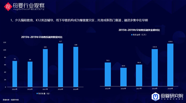 具體到細分領域:2019年很多早幼教機構跑路,在為前些年的泡沫買單。少兒編程教育、K12英語輔導、線下早教機構成為爆雷重災區;托育成新熱門賽道,融資多集中在早期。