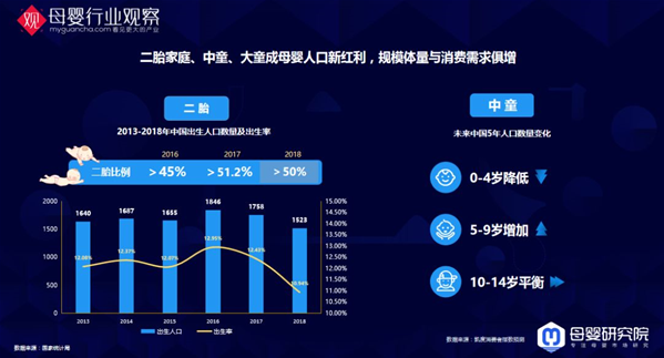 二胎家庭、中童、大童成母嬰人口新紅利,規模體量與消費需求俱增。我們看到2017年開始二胎率已經超過了一半,因為這個數字,整個母嬰行業的結構組成會發生一些潛移默化的變化。例如我們說一胎照書養,二胎當豬養,二胎媽媽對產品的需求,對母嬰對育兒的認知是不一樣的。未來中國5年人口數量變化,0-4歲的人口是下降的,5-9歲是增加的,10-14歲是平衡的。