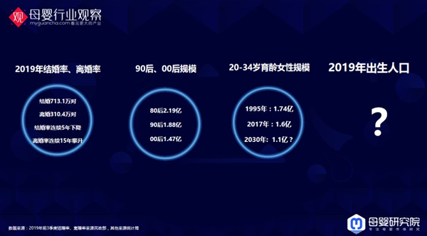 《2019母嬰行業觀察年終報告》,再見2019·回答 1、首先我們來回顧下2019年的關鍵詞大事件,每一個大事件發生的背后,都是一些行業發展、趨勢、或者變革的印證,比如國產奶粉行動提升方案的發布、飛鶴上市、人口出生問題熱議等。我們今天的第一部分內容,也是圍繞2019年母嬰人都在關注的一些問題展開。 這一年,全社會關注的新生兒出生人口怎么樣了? 2019年的出生人口一定是下降的,下降多少我們不做具體的預測了,過兩天權威部門會發布。這個數量下降之前我們往前看,有三組數據可以跟大家分享:1)2019年的結婚率和離婚率:700多萬結婚,有300多萬離婚,結婚率連續5年下降,離婚率連續15年攀升;2)80后到00后數量下滑的非常嚴重;3)20-34歲育齡女性的規模下滑的非常嚴重。這意味著以后的出生人口一定下降的,沒有逆轉的大因素出現,這個趨勢還是往下走的。