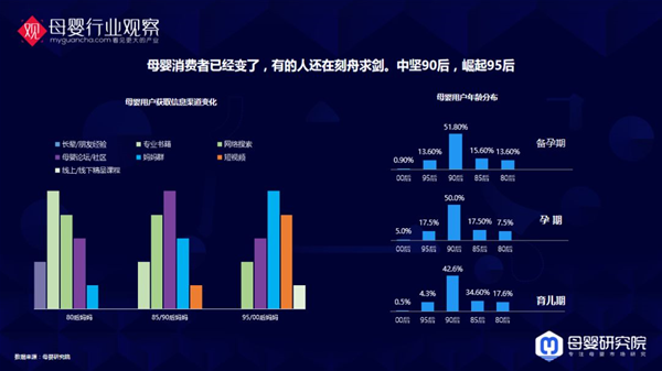 這一年,90后、Z世代、00后正在決定品牌未來嗎? 80后、85后、90后、95后、00后媽媽信息獲取渠道已經發生了很大的變化,95/00后媽媽,短視頻和微信群是她們獲得信息的第一第二途徑,80后是完全不一樣的,她們還去搜索,看專業書籍。同時我們看到在備孕期、孕期和育兒期,90后和95后已經是絕對的中堅主力。