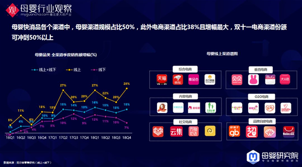 此外,我們未來要深耕五大核心人群代表:個性獨立的職場辣媽、力挺國貨的年輕奶爸、養娃不惜金的小城爸媽、注重產品力的精致派、時髦愛玩兒的大小孩。 這一年,母嬰零售線上增長瓶頸出現了嗎? 母嬰快消品各個渠道中,母嬰渠道規模占比50%,電商渠道占比38%且增幅最大,雙十一電商渠道份額可沖到50%以上。線上的份額還在增長,尤其是一些標品化的產品。