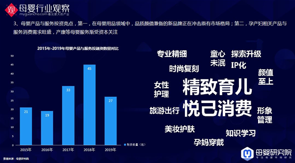 同時我們看到母嬰產品和投資服務的亮點,第一品質顏值兼備的新品牌正在沖擊原有市場格局,這里的代表企業babycare,幾年的時間幾乎把自己在做的類目重做了一遍,而且得到了消費者很大的認可。第二,孕產婦相關產品與消費服務需求旺盛,很多企業是增長非常快的,還有產康服務,這個領域里面的企業像藍絲帶做的非常好,資本都在關注他們。