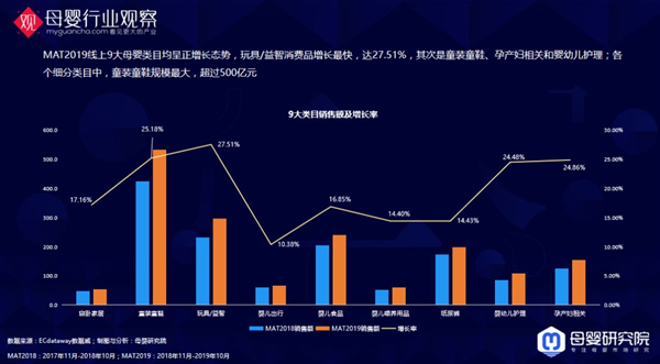 從產業的角度來看,我們將母嬰產品分為九大類目。增長最快的玩具/益智,達27.51%;其次是童裝童鞋、孕產婦相關和嬰幼兒護理;各個細分類目中,童裝童鞋規模最大,超過500億元。
