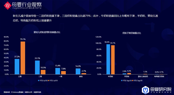 這一年,一段二段奶粉賣不動了嗎? 2019嬰兒食品同比上年增長率為16.85%;其中嬰兒奶粉銷售額超過150億,增長率為14.31%,零輔食、嬰幼兒營養品增長非常迅速,增長率超26%。 新生兒減少直接導致一二段奶粉銷量下滑,三段奶粉銷量占比超79%,另外很多企業都推出了四段奶粉,所以2020可能三四段奶粉是他們的主打產品;此外,牛奶粉銷量同比上年略有下滑,羊奶粉、嬰幼兒液態奶、特殊配方奶粉線上銷量攀升,增長還是很明顯的。