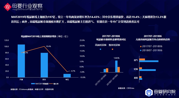 這一年,紙尿褲太“南”了。 我們知道有很多家紙尿褲企業其實已經倒閉了,還是體量比較大的,2019年開始為前些年的冒進、泡沫買單。2019年紙尿褲線上規模為197億,較上一年電商渠道增長率為14.43%;其中京東增速最快,高達19.4%;天貓增速為13.3%緊追其后。 此外,高端紙尿褲市場規模不斷擴大,高端紙尿褲主打的透氣、 輕薄在近一年中廣泛受到消費者認可。