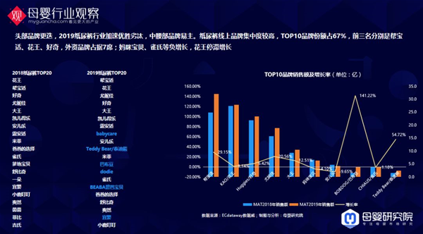 我們看頭部紙尿褲品牌格局,紙尿褲的榜單排名變化的非常大,2019年前三名分別是幫寶適、花王、好奇,外資品牌占據7席;媽咪寶貝、雀氏等負增長,花王停滯增長。