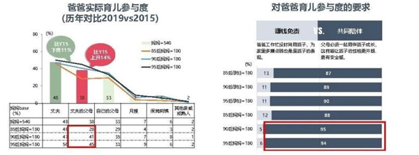 95后媽媽對家庭中爸爸參與育兒的要求更高。絕大多數(shù)95后認(rèn)為,爸爸不能缺席,父母雙方必須一起陪伴孩子成長,有助于兒童健康開朗性格的養(yǎng)成。超級奶爸也成為社會(huì)熱點(diǎn),越來越多奶爸深入伴娃一線,尿片洗護(hù)、奶粉輔食等剛需品是他們偏好的品類,但對童裝、童鞋等偏好較低。