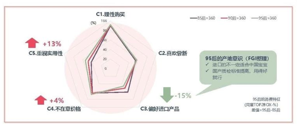 95后母嬰消費(fèi)特點(diǎn):注重實(shí)用性,不執(zhí)著于進(jìn)口 在國貨品質(zhì)的喜愛和信賴感上,95后新生代媽媽的認(rèn)同感日益加深。在相對富裕的環(huán)境中成長起來的95后年輕一代“不差錢”但更理性。信息化社會(huì)為商品傳播提供便利的同時(shí)也讓媽媽可以接觸到更多專業(yè)的知識(shí)。學(xué)習(xí)型媽媽當(dāng)?shù)溃麄兏迷趺唇o孩子挑選更好的。因此,相比其他年齡段的媽媽,95后更注重實(shí)用性、不在意價(jià)格、對進(jìn)口產(chǎn)品偏好度較低。95后的產(chǎn)地意識(shí)表現(xiàn)為“進(jìn)口的不一定適合中國寶寶”、“國產(chǎn)質(zhì)檢標(biāo)準(zhǔn)提高,用得好就行”。