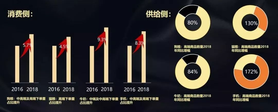 從中國品牌和國際品牌的人群類型分布來看,一般收入及中低收入類型的消費者更愛選擇中國品牌商品,中高收入及高收入人群更愛選擇國際品牌商品。中國品牌在獲取中高收入的增長上還需努力,低收入人群中國品牌占比增速最低,接近飽和。 新動力:電商平臺擔起擴消費促升級的雙重任務 京東聚焦高質量商品,促進消費與供給的雙重升級。從消費者下單的產品價格段分布分析,消費者越來越多地開始選擇中端、中高端及高端的商品,呈現出消費結構升級趨勢。 從供給側角度來看,中國品牌商品結構升級趨勢也較為明顯,以消費升級典型品類的狗糧、貓糧、手機、嬰幼奶粉等品類為例,中高端商品的商品數量2018年的同比增幅都超過了品類整體水平,高端商品數量持續走高,說明品牌商傾向于在高端商品上拓展產品線,也得到了市場的認可。