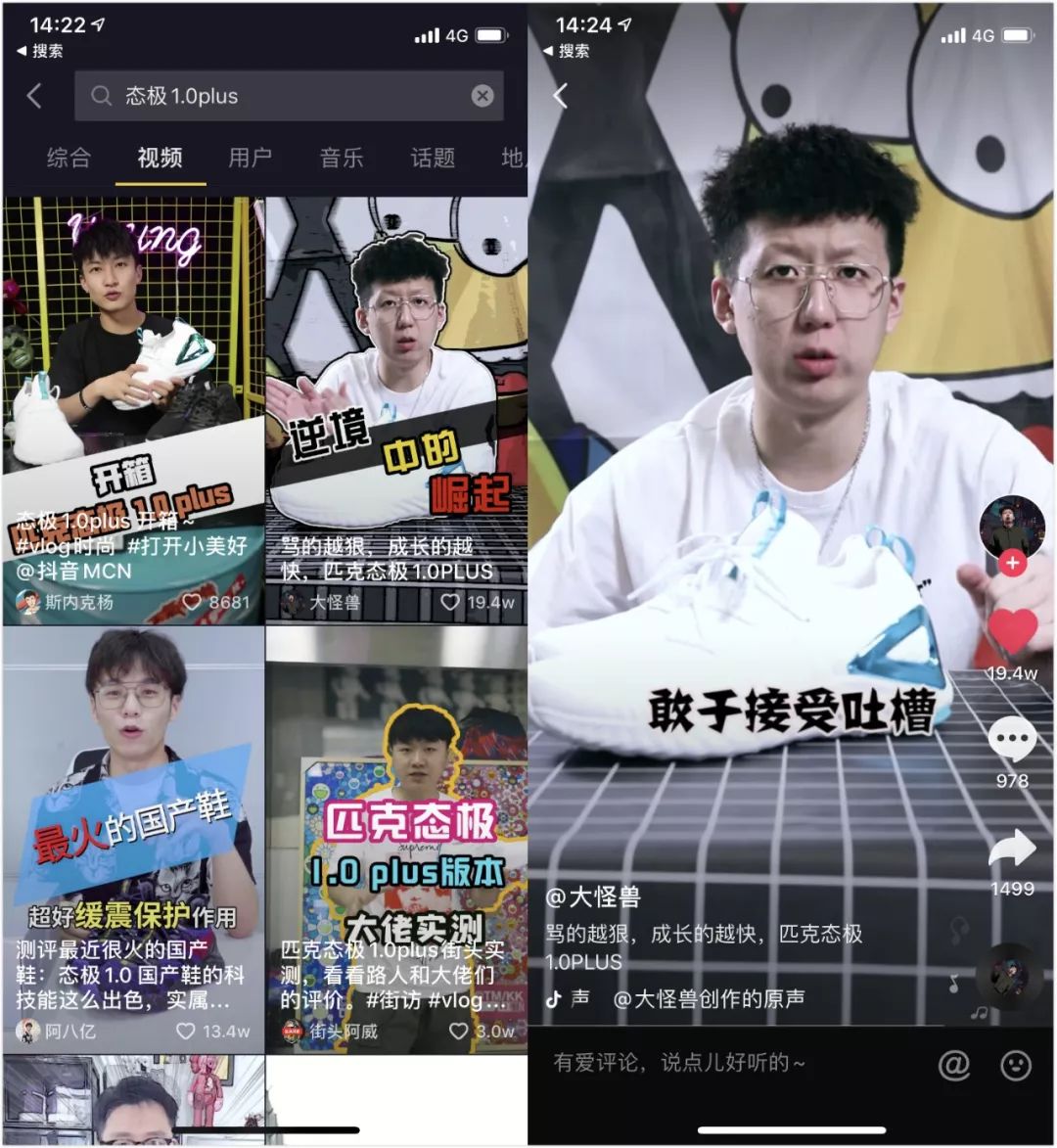 勢頭起來后,再安排運動、好物、國貨接力助推,同時抖音上鞋類大號同步測評,而微博則在搬運中起到延長傳播。 憑著國貨科技火到國外這一策略,毒角SHOW個人在抖音、微博、騰訊視頻等多個平臺總共帶來1440萬播放,抖音252萬點贊量達到其歷史第一,實際帶貨效果非常好,當然態極產品本身的產品力也是根本。 出口轉內銷的策略有時也需要針對品類做具體措施。匹克態極籃球鞋戰役中,贊意策劃再次邀請毒角SHOW合作,先是美國鞋王店長(中國90后)買入態極籃球鞋并高價出售,后讓毒角SHOW到店內做采訪,道出鞋王賣態極是因為認可態極的產品力,認為中國終于有抗衡國外品牌的核心科技了,最后再在球場找球迷實際眾測大獲專業好評……當期毒角SHOW視頻獲得266萬點贊量火爆刷新其抖音記錄,結果就是態極籃球鞋銷售數據直線上升。 這一系列組合下來已經不是簡單的出口轉內銷了,實際是一條兼具國外權威銷售認可+產品溢價能力+受眾專業眾測的策略,產品好+國貨爭光的戰狼體宣傳之下帶貨效果不言而喻。 所以出口轉內銷的種草和拔草,關鍵是點要找好-梗要埋巧-引爆要騷。