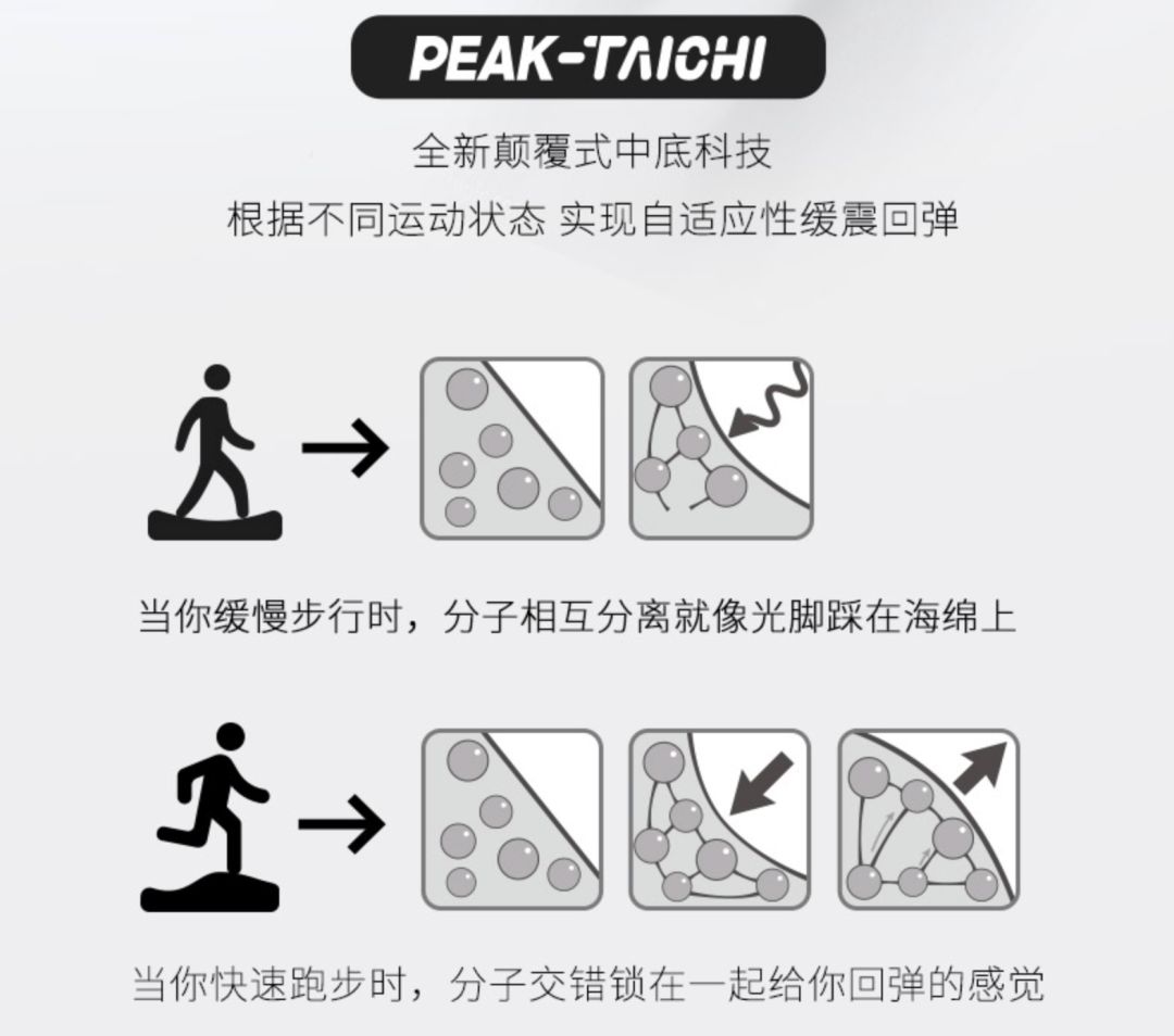 年前12月底匹克透露,態極產品線全年銷售量超250萬雙,銷售額破10億。年初排名國產運動品牌線上第六七名的匹克,到年末時僅次于安踏、李寧,時隔多年又做到線上第三。 一個新品如何做到一年帶貨10億,給匹克帶來類似“中國李寧”般的回歸?怎么跳出創意迷信,在跌跌撞撞中走出自己的步子? 一、營銷策略: 打爆態極大單品,態極科技跨品牌增長 匹克曾一度做到國產運動品牌的第一,而后經歷退市等一系列暗淡時刻,掉到第二梯隊。直到2018年底研發出態極科技,才在產品上,找到騰飛的后盾。 品牌要基業長青,毫無疑問,最基礎是產品有核心競爭力。態極科技之于匹克,猶如boost科技之于阿迪達斯,AIR科技之于耐克。態極科技,是一種“遇軟則軟,遇強則彈”的神奇新材料。用鞋友們的話說,“像踩在云上、棉花上”。