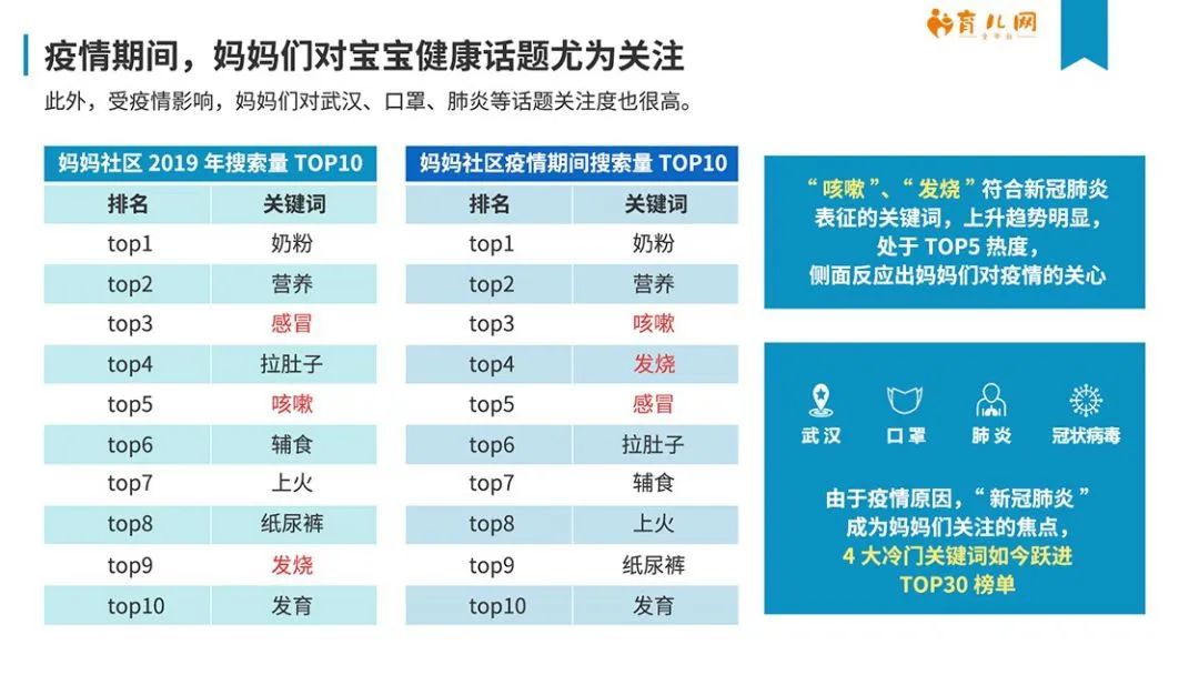 從健康類話題參與度上,也能看出媽媽們對(duì)于疫情的關(guān)注度:“武漢”、“口罩”、“肺炎”、“冠狀病毒”由冷門迅速成為熱搜焦點(diǎn),“咳嗽”、“發(fā)燒”、“感冒”等新冠肺炎表征關(guān)鍵詞上升趨勢(shì)明顯,處于媽媽社區(qū)APP Top5熱度。