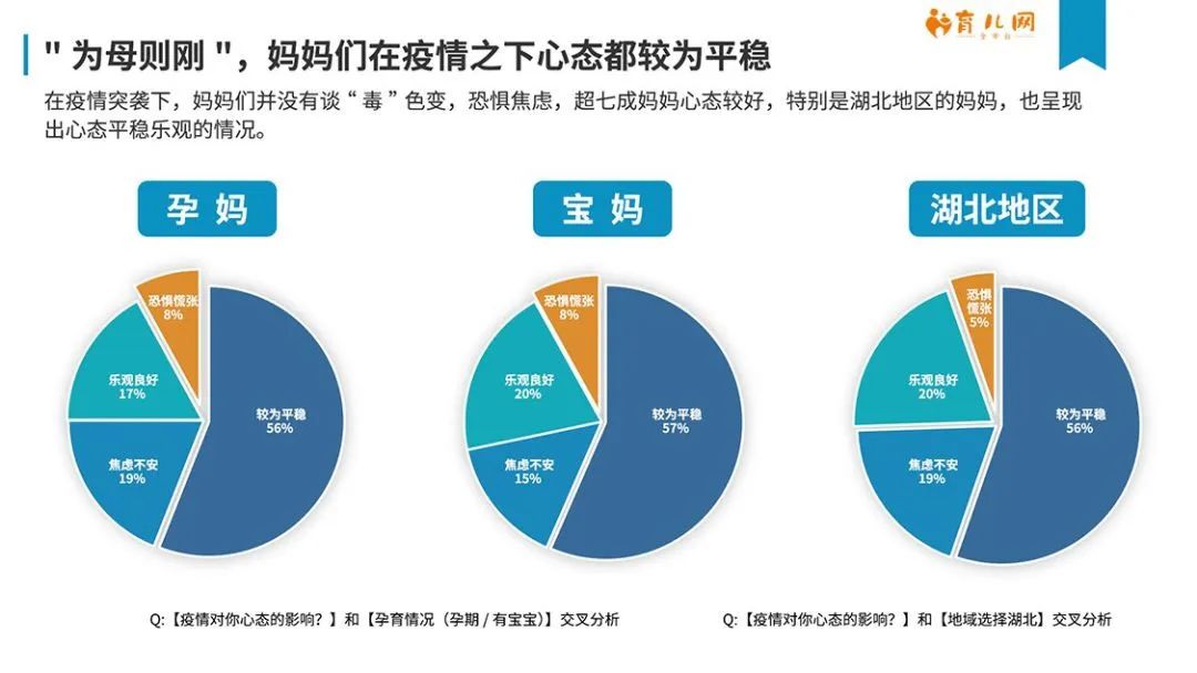 孕媽寶媽生活受影響但情緒平穩(wěn) 疫情蔓延,病情進(jìn)展自然是絕大多數(shù)人關(guān)心的頭條。母嬰人群雖然也不例外,不論是孕媽還是寶媽,疫情關(guān)注度均超過75%。不過作為特殊人群,她們對(duì)于自身需求的關(guān)切度尤為凸顯。 準(zhǔn)媽媽們一方面普遍缺乏育兒經(jīng)驗(yàn),而且涉及腹中胎兒的安全,所以“孕期產(chǎn)檢(63.52%)、胎兒發(fā)育(47.17%)”成為孕育人群最關(guān)心的話題。另外,為嚴(yán)防新冠病毒院感情況,全國多個(gè)地區(qū)的公立醫(yī)院除保留發(fā)熱門診、急診等必要科室外,其他科室暫時(shí)停診,門診部、專科診所等也都全面停診,加上公共交通的傳染危險(xiǎn)性較大,準(zhǔn)媽媽又是傳染病易感染群,產(chǎn)檢的時(shí)間安排受到很大影響,“無法正常產(chǎn)檢”成為56.13%的孕媽出行方面最大的影響。 而已經(jīng)育有子女的媽媽,自然最關(guān)心家庭成員的安全健康,有超過69%的媽媽關(guān)注這一問題。有網(wǎng)友說“2003年我害怕,因?yàn)槲疫是個(gè)孩子,2020年我害怕,因?yàn)槲矣袀(gè)孩子”,生動(dòng)的形容了這種狀態(tài)。而出行方面,如何和孩子在家度過一個(gè)沒有游樂場(chǎng)博物館旅游區(qū)的假期,成了寶媽們的煩心事。