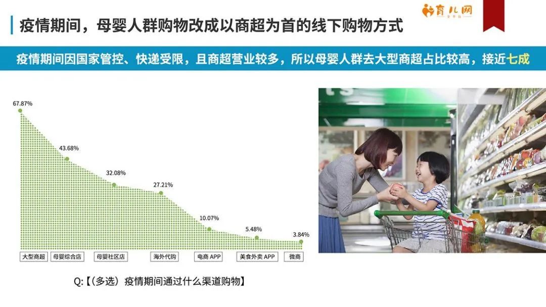 可見,母嬰人群除了和疫情相關(guān)的信息,更關(guān)心和“母嬰“緊密相關(guān)的主題,這一點(diǎn)需要母垂類APP來滿足。作為特需人群,孕媽、寶媽們高度依賴母嬰APP,以尋求對(duì)疫情問題、孕育問題的相關(guān)解答。 商超受寵:少出門多囤貨,營養(yǎng)品市場(chǎng)大 教育、娛樂線上一派火熱,但購物消費(fèi)方面線下華麗逆襲。因?yàn)閲夜芸兀爝f受限,日常極其方便的網(wǎng)絡(luò)購物顯出疲態(tài),貨量足離家近支付快不停業(yè)的線下商超成為母嬰人群消費(fèi)的首要購物方式,67.87%的受訪者選擇大型商超購買商品。畢竟吃喝穿用不能虛擬,物流快遞受限無力,相比線上虛擬購物,商超更加眼見為實(shí),售后也更方便快捷。更何況遠(yuǎn)水解不了近渴,帶貨再好也要快遞給力。
