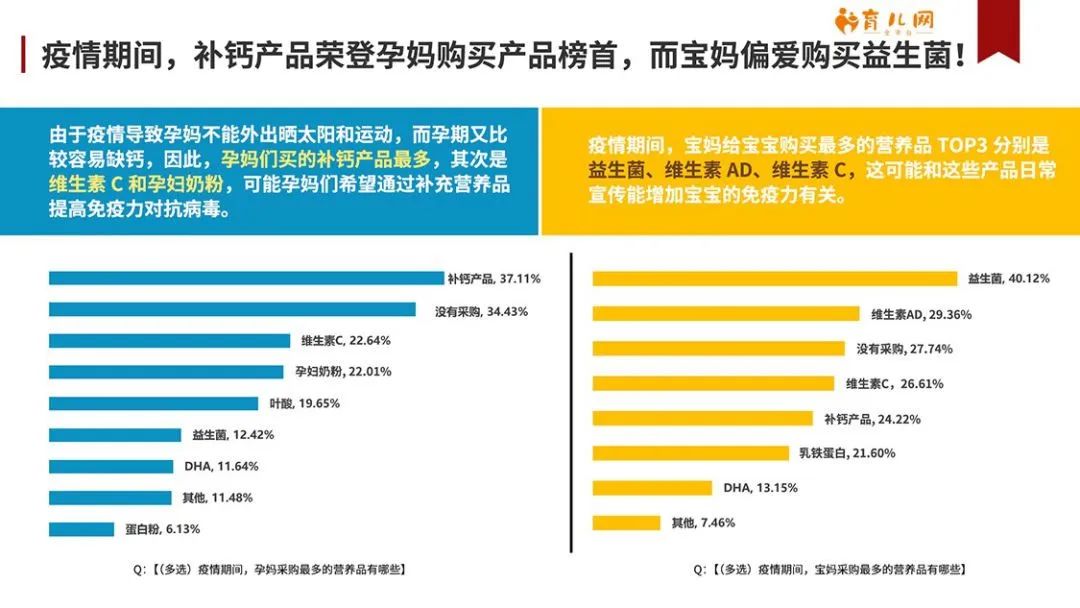 或許是“紙尿褲加工廠被征做口罩”的猜測(cè)讓媽媽們擔(dān)憂,加上疫情期間快遞不便,嬰幼兒對(duì)紙尿褲需求量大,因此疫情期間“紙尿褲”成為母嬰人群囤貨之王。 除了吃喝拉撒這種日常必需品,母嬰人群對(duì)于健康的需求無疑是巨大的市場(chǎng),而在疫情期間這一需求更為突出。準(zhǔn)媽媽們無法在疫情期間外出活動(dòng),而孕期又較易缺鈣,因此補(bǔ)鈣類產(chǎn)品最受孕媽們青睞,占比37.11%。而維生素C和孕婦奶粉也擁有超過22%的選購比例,可見孕媽群體認(rèn)可補(bǔ)充營養(yǎng)品提升免疫力的觀念。 而一旦有了寶寶,寶媽們營養(yǎng)品消費(fèi)的重點(diǎn)就完全轉(zhuǎn)移至兒女身上,益生菌、維生素AD、維生素C等日常宣傳能增加免疫力的產(chǎn)品成為Top3,益生菌的選購占比更是超過4成!