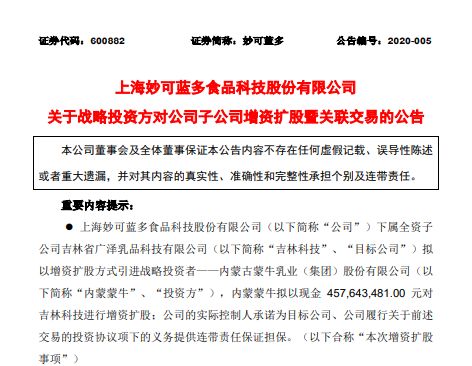2020年國內(nèi)第一宗食品巨頭收購案,主角仍是去年連番買買買的蒙牛! 剛剛,在上交所上市的上海妙可藍(lán)多食品科技股份有限公司(簡稱“妙可藍(lán)多股份”)發(fā)布公告披露,蒙牛乳業(yè)集團(tuán)通過約2.8億元對(duì)價(jià)獲得上市公司妙可藍(lán)多股份5%股份,通過約4.6億元對(duì)價(jià)獲得擁有上市公司幾乎全部產(chǎn)能資產(chǎn)的子公司吉林科技42.9%股份。總對(duì)價(jià)約7.4億元。