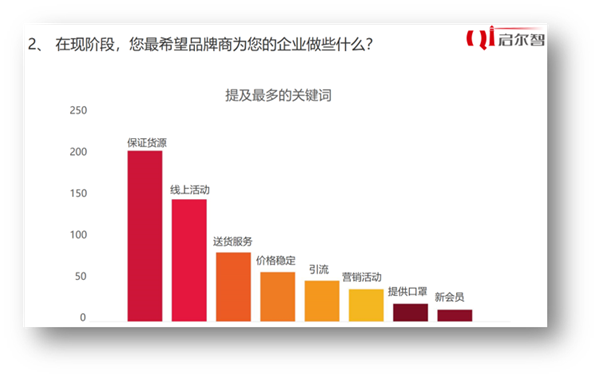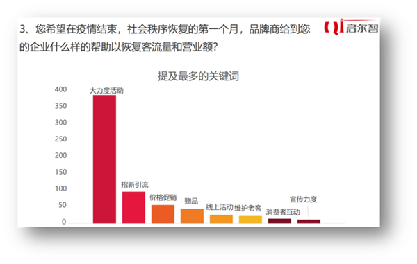 社會(huì)秩序恢復(fù)的第一個(gè)月,企業(yè)希望品牌商提供什么樣的幫助以恢復(fù)客流量和營(yíng)業(yè)額?報(bào)告顯示接近有400人希望品牌商可以提供大力度活動(dòng)來刺激顧客消費(fèi),不只是希望品牌商提供降價(jià)促銷活動(dòng),例如通過媽媽班與消費(fèi)者做情感連接是我們做活動(dòng)的主題。