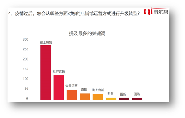 疫情過后希望從哪些方面對(duì)店鋪運(yùn)營(yíng)方式進(jìn)行升級(jí)轉(zhuǎn)型?最多被提及的是線上銷售和社群運(yùn)營(yíng),從前我們總是害怕把客人引流到線上最終到店消費(fèi)的人就少了,面對(duì)疫情我們必須做出改變,對(duì)經(jīng)營(yíng)模式進(jìn)行一系列的改變。