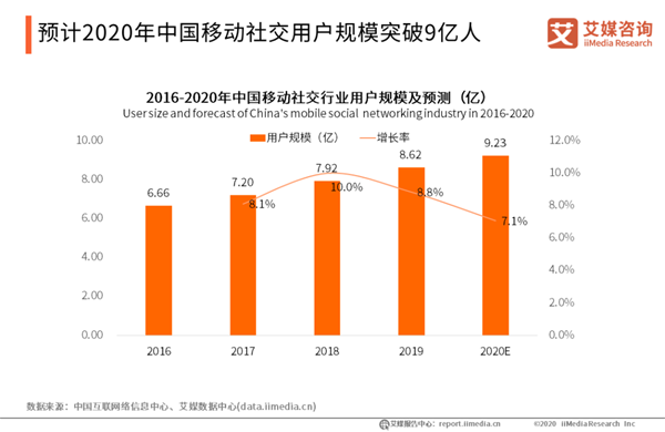 預計2020年中國移動社交用戶規模突破9億人 iiMedia Research(艾媒咨詢)數據顯示,2019年中國移動社交用戶規模達8.62億,預計到2020年用戶規模突破9億。艾媒咨詢分析師認為,龐大的移動社交用戶規模也意味著更多的市場可能性。