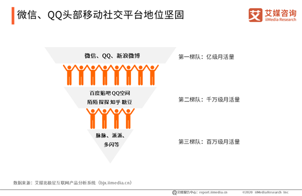 微信、QQ頭部移動社交平臺地位堅固 iiMedia Research(艾媒咨詢)數據顯示,在中國主流移動社交平臺月均活躍用戶規模方面,競爭格局趨于穩定。微信、QQ、微博以億級月活量位居移動社交行業第一梯隊,而第二、第三梯隊月活量也分別達到千萬級、百萬級。微信、QQ頭部地位難以撼動, 2020年1月月活量分別達到10億、6.5億,而微博月活量也在3億左右。與此同時,在內容社區、陌生人社交等細分賽道上競逐激烈。