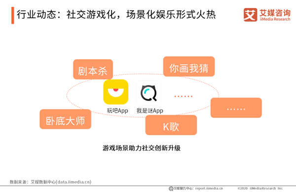 行業動態:社交游戲化,場景化娛樂形式火熱 伴隨移動社交用戶的迭代,以95、00后為主的年輕新世代成為中國移動社交市場的主力軍。這部分年輕用戶更青睞于輕松、趣味社交形式,移動社交廠商也開始尋求泛娛樂類的社交產品,其中包括玩吧App 、我是謎App等多款泛娛樂類社交產品。如今娛樂游戲與社交更深度融合,除游戲社交化以外,社交也呈現出游戲化的趨勢。艾媒咨詢分析師認為,社交游戲化,推動社交場景娛樂化,通過小游戲、語音互動等方式為用戶創造豐富和封閉的娛樂場景,釋放社交壓力的同時增加趣味性和沉浸感,更契合當下95、00后的新型社交需求。
