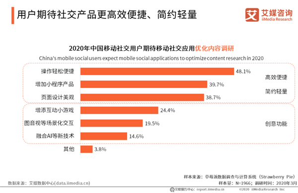 用戶期待社交產品更高效便捷、簡約輕量 iiMedia Research(艾媒咨詢)調研數據顯示,近五成的受訪用戶期待移動社交應用在操作上進一步優化使用體驗,與此同時,也有近四成的受訪用戶對小程序產品、產品頁面設計提出一定要求。艾媒咨詢分析師認為,移動社交用戶對操作便捷、小程序開發及頁面設計美觀等有著普遍需求,這側面映射出當前移動社交用戶更青睞于高效便捷、簡約輕量的社交產品。