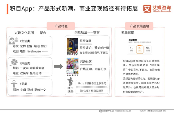 積目App:產品形式新潮,商業變現路徑有待拓展 積目App倡導以興趣為基礎,服務于青年文化,為藝術、音樂、潮流、時尚等圈子搭建平臺。在興趣文化氛圍打造方面,積目產品形式較為新潮,同時納入主流、小眾愛好。此外,積目App還在線上社交的基礎上,為用戶提供線下社交場景。整體而言,積目具有較好的產品特色,但其商業變現路徑可行性仍有待進一步驗證。