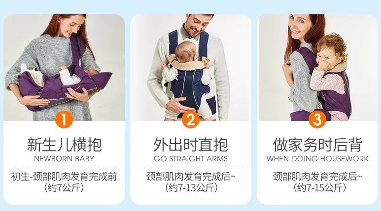 該款背帶可單肩使用,亦可雙肩使用,適用于0-36個月嬰幼兒。其中,針對新生兒頸部肌肉還未發育完成的狀況,約7公斤可使用單肩橫抱。隨著嬰兒的增長,頸部肌肉發育完成后,約7-13公斤時,外出可采用雙肩直抱的模式。同時,在幼兒約7-15公斤時,在家做家務時也可采用雙肩后背的形式,幫助新生代父母有效加重,讓出行更省力。