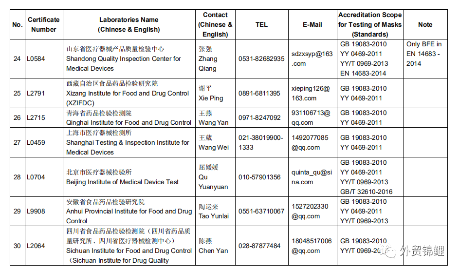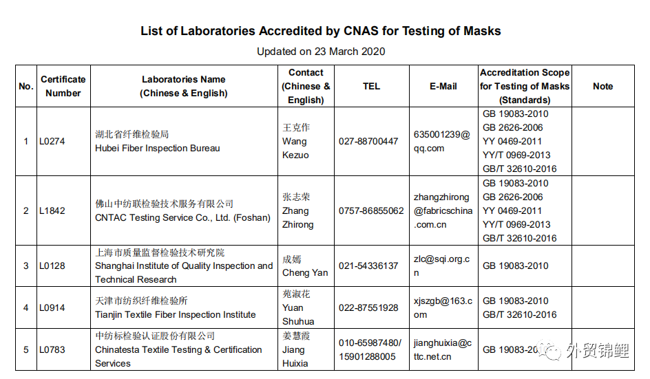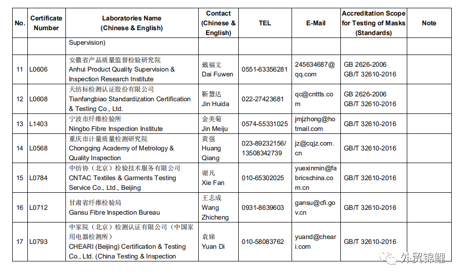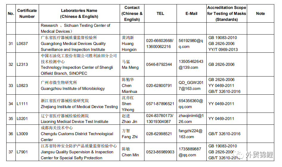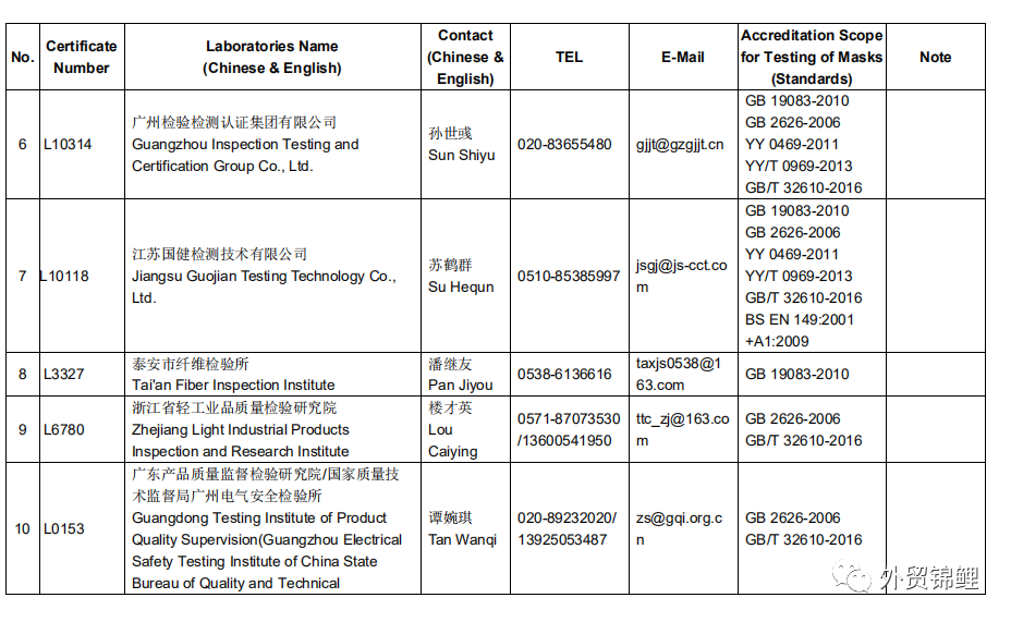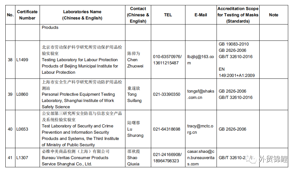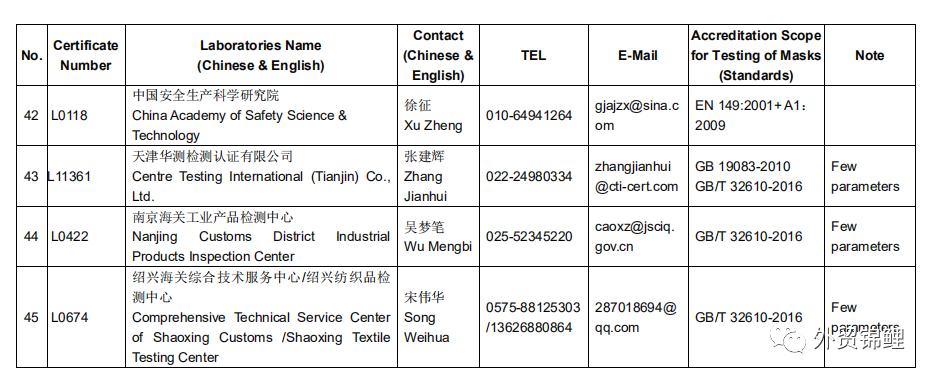 要點:檢測報告必須是CNAS 指定的46家檢測機構認證的才有效,其他任何機構認證的都作無效處理,航司/船期會拒絕裝載貨物。如果有近期出口罩的伙伴務必要核實自己的檢測報告是否有效,以下為官方認可的檢測機構,如需完整表單找小編索取。