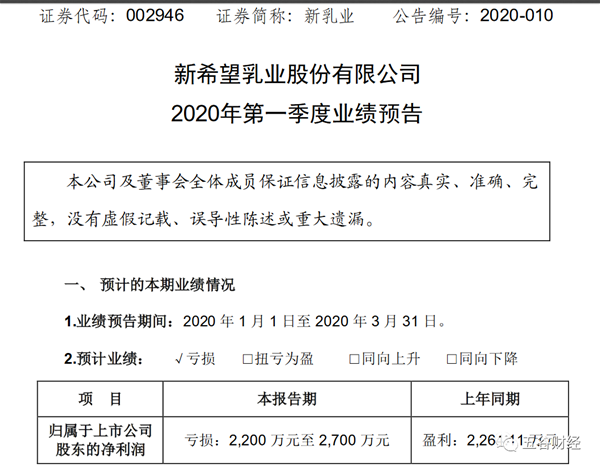 4月15日午間,新乳業(yè)(全稱“新希望乳業(yè)股份有限公司”)公開了2020年第一季度業(yè)績預(yù)告,受新冠疫情影響,新乳業(yè)經(jīng)營和對聯(lián)營公司的投資收益受到負(fù)面沖擊,預(yù)計(jì)2020年第一季度業(yè)績將出現(xiàn)虧損。 公告顯示,2020年第一季度,新乳業(yè)歸屬于上市公司股東的凈利潤虧損2200萬元至2700萬元,而去年同期盈利2264萬元左右。