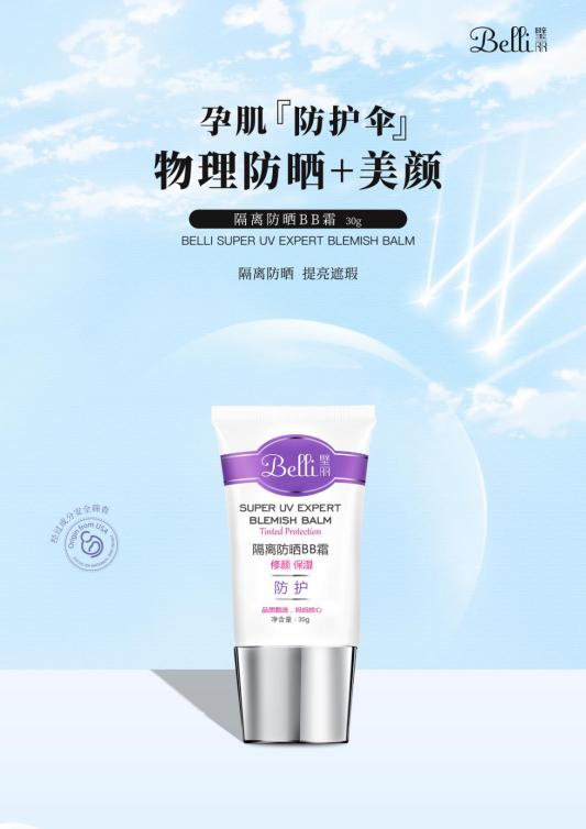 一、安全物理防曬,孕期放心使用 Belli隔離防曬bb霜,經過嚴苛的成分安全篩選,是孕婦可使用放心的物理防曬配方和養膚成分。它采用氧化鋅和二氧化鈦物理防曬成分閆妍博士表示,化學防曬劑會給肌膚帶來一定的風險性。目前市面上很多修顏霜添加人工色素或者氧苯酮等紫外線吸收劑,這類成分不僅對肌膚有風險,也不適合孕期人群使用。可能對胎兒的發育造成負面影響。而Belli隔離防曬bb霜采用純物理防曬孕期可以放心使用。 二、修顏遮瑕保濕滋潤不脫妝 Belli隔離防曬bb霜不僅成分安全,作為一款隔離霜, 除了隔離彩妝及外界污染對肌膚的傷害。它的遮瑕修顏的效果也是非常強大的。在遮瑕排行中也是穩居榜首。